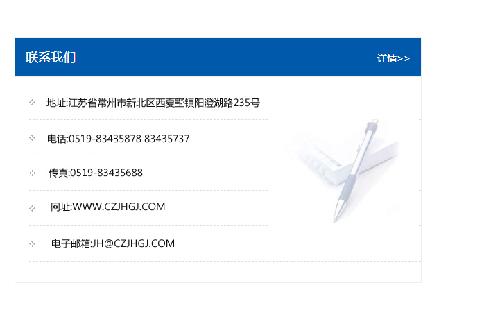 地址:常州市新北區友邦商務大廈1幢16、17層  電話:0519-85101652  傳真:0519-85112595  郵編:213022  網址:www.cz-jiayue_cn.wangliansoft.com  郵箱:xiajifengaa@163.com